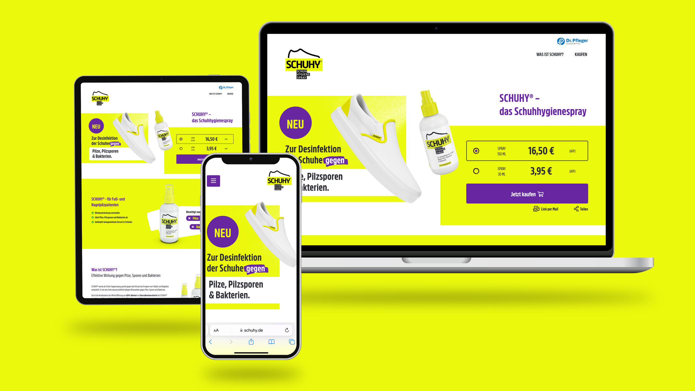 Wir gestalteten für Schuhy ein strahlendes Markendesign, das die effektive Wirkung gegen Pilze, Sporen und Bakterien unterstreicht und die Marke kraftvoll und einprägsam präsentiert.