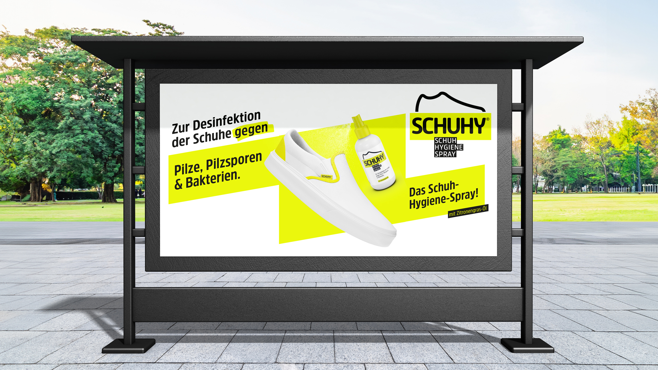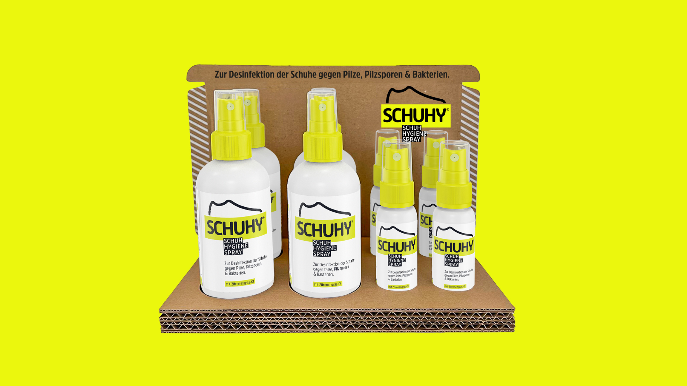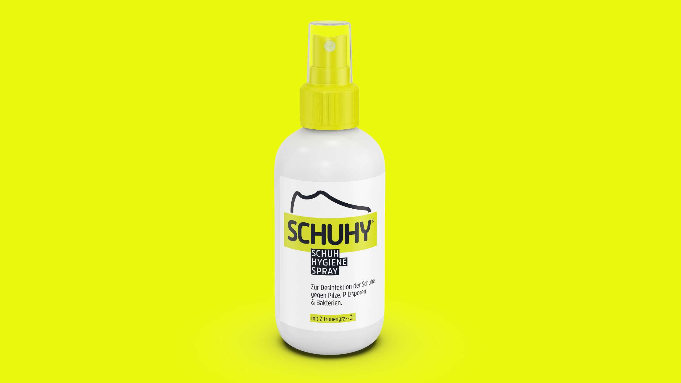 Wir gestalteten für Schuhy ein strahlendes Markendesign, das die effektive Wirkung gegen Pilze, Sporen und Bakterien unterstreicht und die Marke kraftvoll und einprägsam präsentiert.